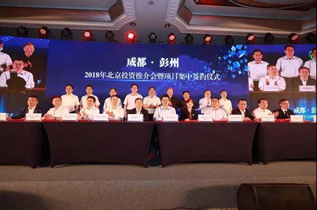 2018年5月22日上午10時(shí),“成都·彭州2018年北京投資推介會(huì)暨項(xiàng)目集中簽約儀式”在北京正式舉行。彭州市政府與央企投資協(xié)會(huì)、易明醫(yī)藥、中國航天科工集團(tuán)、北京壹瓶房產(chǎn)、北京中農(nóng)勁騰等舉行了8個(gè)項(xiàng)目的集中簽約儀式,總投資高達(dá)274億元,涵蓋了生物醫(yī)藥、航空航天、山地旅游等彭州市主導(dǎo)產(chǎn)業(yè)。來自京津冀地區(qū)的央企代表、行業(yè)知名企業(yè)代表約200人出席,易明醫(yī)藥董事長高帆先生作為醫(yī)藥企業(yè)代表出席簽約儀式。
